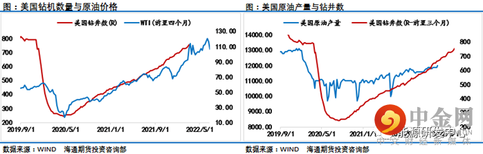 OPEC+长达2年的减产合作即将到期,未来供应端的变化引人关注,最近的6月会议上OPEC+部长们同意在7月和8月日增产64.8万桶原油,提升增产幅度引发了市场各方猜测。之前就有消息人士称,美国总统拜登计划访问沙特阿拉伯之际可能会说服沙特方面增加产量以帮助缓解原油价格涨势和通胀压力。近期市场又传出OPEC考虑结束减产,部分OPEC代表称,成员国正考虑八月本轮减产后期结束后下一步产量政策。有可能取消自2016年以来产量配额限制,转为自由增产;另外越来越多的数据证明俄罗斯原油损失量将远低于之前市场预期,虽然西方国家对俄罗斯进行了史无前例的严厉制裁,但俄罗斯原油仍然找到了买家,继4月大幅下降之后,俄罗斯原油出口量目前已恢复到冲突前水平,同时其炼油厂原油加工量和石油产量仍保持强劲。睿咨得能源大幅上调了2022年俄罗斯原油产量预测,在之前预测的870万桶/日的基础上增加了近70万桶/日。之前EIA在能源展望上也大幅上调了俄罗斯原油产量。上周美国石油钻井平台增加了10口,至27个月以来新高594口,为今年最大的单周涨幅之一,可能表明美国石油产量最终将开始以更快的速度增长。之前美国原油也在疫情之后首次回到1200万桶/日的产量。虽然供应端也有利比亚产量不稳定等因素,总体来看供应端的评估得到了上修,后续会逐渐施压油价。