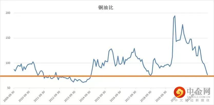 铜油比也跌落到80附近,上次该数值出现在2018年9月。历史上,每当铜油比走低到一定程度,它就会像“美债收益率曲线倒挂”指标一样,给经济戴上衰退的“紧箍”。