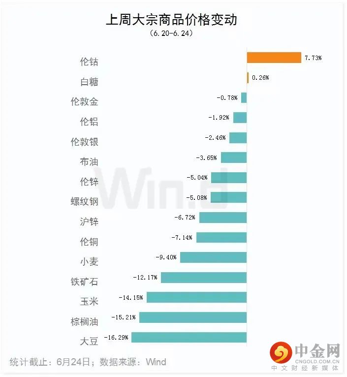 上周,无论是工业品还是农产品基本全部下行,只有伦钴和白糖上涨,其中农产品下跌幅度最大。