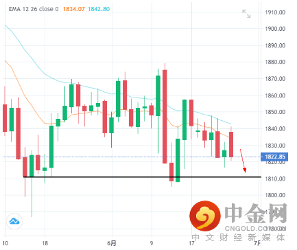 上一个交易日(6/27)黄金收跌,开盘价为1837.86,最高到1841.14,最低来到1820.87,最后收于1822.85。于今日(6/28)开盘价为1822.85。