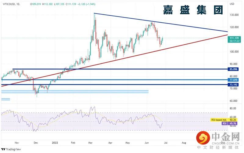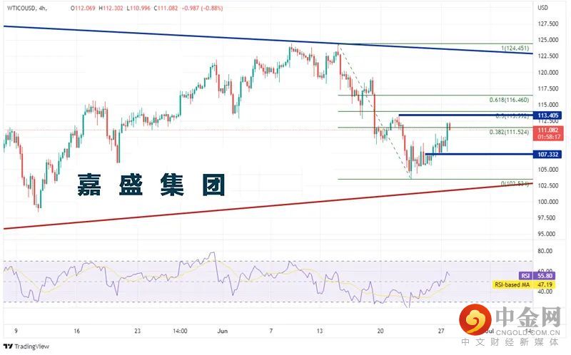 西得州原油4小时图回调至6月14日高点到6月22日低点行情的38.2%回档位,即111.52附近,上档阻力有6月21日以来高点113.40、前述行情分别落在113.99和116.46的50%和61.8%回档位。如果市场出现增产预期并导致油价下跌,则下档支撑位先后有周一低点107.33附近、6月22日低点103.53以及对称三角形的下轨上升趋势线(请看下图红色线)102.00附近。
