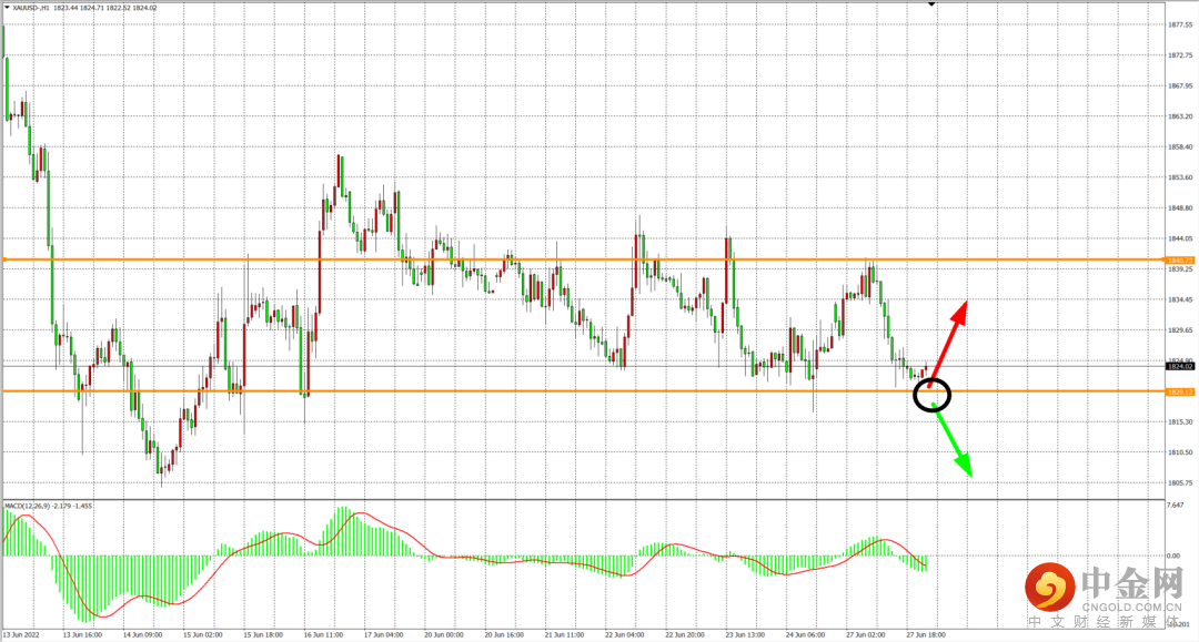 1小时图看,金价反弹1840后受压回落,当前再度回探至1820关口附近,继续延续横盘震荡走势,箱体主要为主1820-1840。日内若无法突破该区间趋势依旧难以确认,操作仍以箱体内高空低多为主,若跌破下方1820,则下看1800关口,若上破1840,则上看至1860附近。