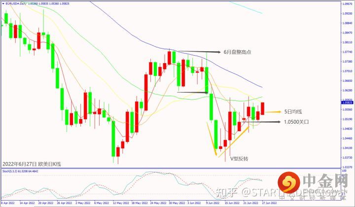 日级别线图,近期在1.0500关口上盘整,守住5日均线,可能挑战6月盘整高点。