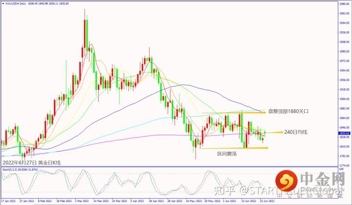 日级别线图,近期维持区间震荡,若重回240日均线,可能挑战1880美元。