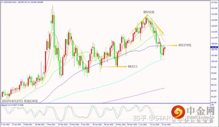 日级别线图,跌破60日均线三天,反弹冲不过该均线,可能回测98美元。