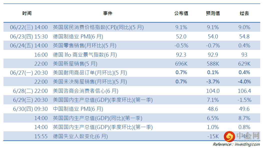 5月成屋签约销售指数止步六个月连降,但仍比去年同期低了13.6%。5月耐用品订单增幅高于预期,表明在利率上升和对经济担忧加剧的情况下,企业投资保持强劲。本周重要的经济数据还有周四发布的5月PCE物价指数。
