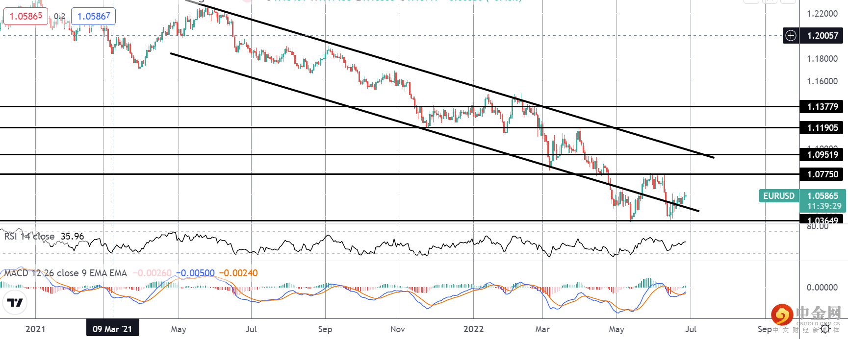 EURUSD双底值得关注 欧元兑美元的价格走势在这里开始看起来很有趣。从 2021 年高点开始,该货币对在明确定义的熊市通道内稳步走低。然而,最近我们看到该货币对在 1.0364 水平找到了很大的支撑,这暂时停止了下跌。我们看到围绕当前水平的动量研究出现了巨大的看涨背离,可能会形成大规模的双底交易。考虑到这一点,交易者应密切关注 1.0775 水平,寻找该水平的突破目标 1.0951 和 1.1190 之后。 密切关注 本周欧洲央行拉加德的评论将受到密切关注。欧洲央行正准备在 7 月进行十多年来的首次加息,市场对有关该行未来几个月可能采取何种行动的任何进一步线索高度敏感。目前,预计 7 月加息 0.25%,9 月可能会出现更大的加息。拉加德今天的开场评论强调了这些会议的上行风险。如果该银行被认为变得更加鹰派,或者变得更加鹰派,随着美联储和欧洲央行之间的货币政策分歧进一步缩小,欧元兑美元短期内可能会大幅反弹。因此,密切关注拉加德对该事件的进一步评论非常重要。 免责声明:提供的材料仅供参考,不应视为投资建议。 本文中表达的观点,信息或观点仅属于作者,而不属于作者的雇主,组织,委员