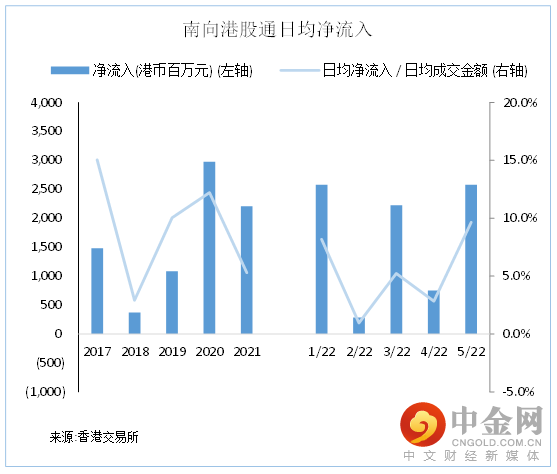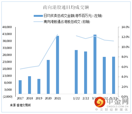 透过港股通南下买卖港股月度日均买卖总成交额于2021年1月及2月达到698.6 - 713.7亿港元高水平,其后在2021年3 - 12月于268.0 - 481.5亿港元徘徊。2022年年初以来大市表现低迷,透过港股通南下买卖港股5月日均买卖总成交额为267.4亿港元,较4月年初以来最低水平轻微回升0.6%,但较去年全年平均水平417.1亿港元低36%。2022年5月份南向港股通日均买卖总成交额占港股总成交为11.2%,与2021年全年平均12.5%及2022年4月份11.4%接近,显示港股通南下买卖港股日均买卖总成交额年初以来之下跌实际与整体大市成交额变动趋势靠近。