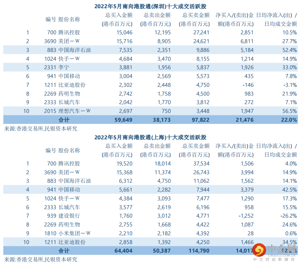 港股通(沪港通及深港通) 南下买卖港股可参考附表。2022年5月份沪港通及深港通南下买卖港股十大成交活跃股总体表现一致,分别录得净流入140.2亿港元及214.8亿港元。沪港通及深港通十大成交活跃/ 日均成交金额比例分别处于12.2%及22.0%,较同月港股通南下买卖港股整体比例9.6%为高,显示资金对权重股买意更高。个别股份如中国海洋石油(883 HK)、李宁(2331 HK) 、理想汽车(2015 HK) 、中国移动(0941 HK)和比亚迪股份(1211 HK)于沪港通或深港通日均净流入/ 日均成交金额高达33.0-56.5%。