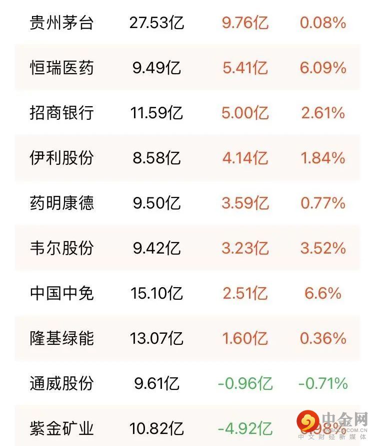 北向资金6月27日净买入72.65亿元,其中贵州茅台、东方财富、恒瑞医药分别获净买入9.76亿元、7.84亿元、5.41亿元;宁德时代被净卖出额居首,金额为8.13亿元。