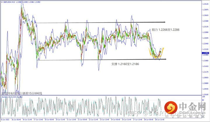 日级别线图,维持在1.2200关口上方盘整,5日均线若突破,可能挑战1.2300关口;15分钟K线,出现圆形底反转,守住盘整底部,大有可能上看起跌阻力。