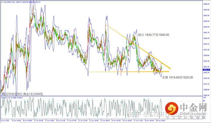 昨天(28日)欧洲央行行长拉加德对通胀影响经济示警,以及美联储官员预期持续加息利好美元上涨,也让黄金回落至1820美元附近整理。预期今天(29日)欧美公布经济数据大都不佳恐造成股指大跌,黄金价格若突破5日均线1822美元,建议可短多操作。