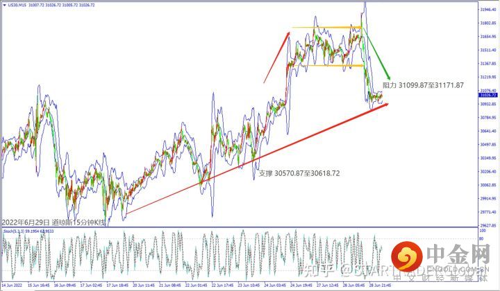 昨天(28日)欧洲央行行长和美联储官员预期持续加息,造成欧美股指皆跌逾2%。预期今天(29日)欧元区公布经济大都不佳,德指一旦跌破5日均线13,102,建议可短空操作。预期今天美国公布经济数据大都不佳,道琼斯冲不过小时布林带上轨线31,173,建议可短空操作。