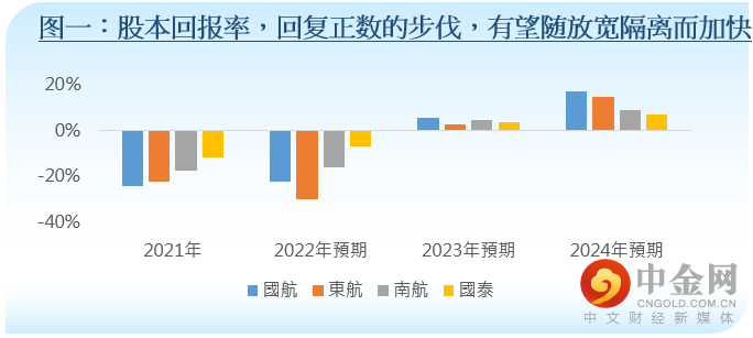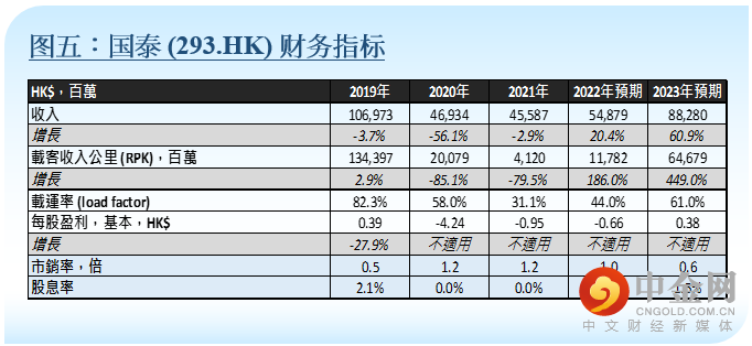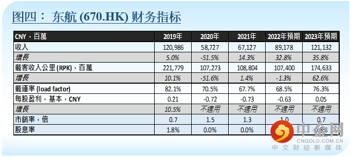 内地三大航空国航、南航、东航,以及国泰,其股价较 2019 年首波新冠 疫情前的高位,现仍有 40% - 60%折让,而请见图二至五, 若上述载客收入公里、载运率,随放宽隔离而大幅回升,届时 股本回报率 (请见图一 ),从今年 2022 年时负数水平,恢复至明年 2023 年正数水平的步伐,或有望加快,加上上述可观 折让,这将迎来不俗的博反弹吸引力。亦值得注意的是, 若及后出现延续/ 加大放宽的趋势, 并提振 『「零感染」策略,或有所调整』的憧憬, 届时可能会为上述航空股股价,进一步 加添催化作用。