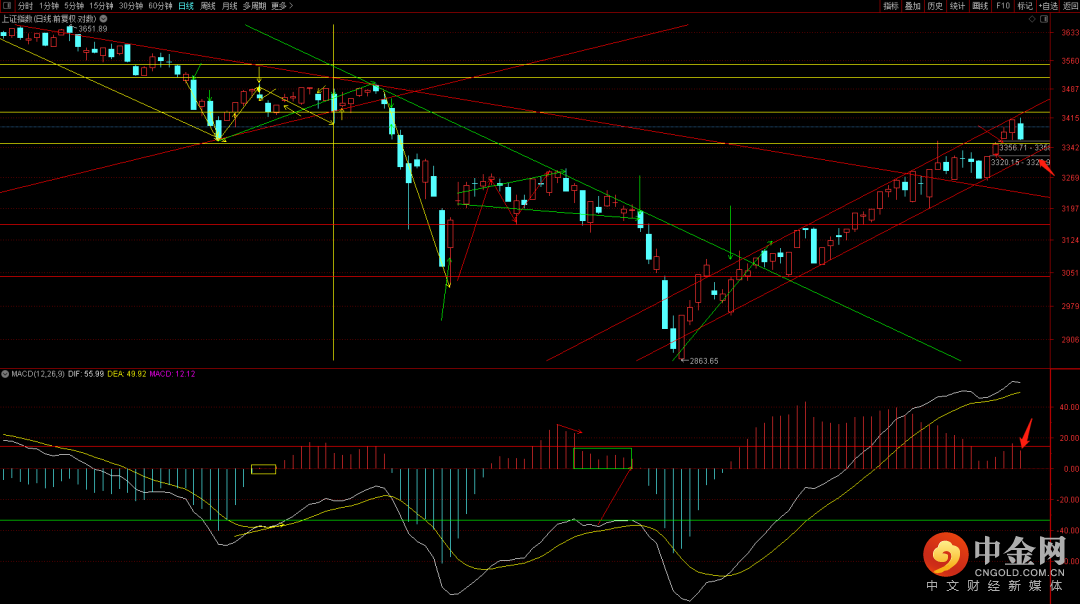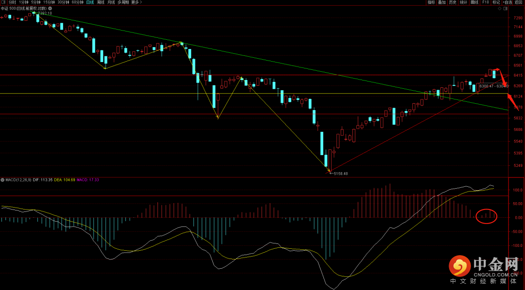 沪深300如期出现阴线调整,短期注意观察日线macd量柱的变化,只要能够再次扩张上扬就还有再次新高的可能,但如果呈现连续三天萎靡的状态,则调整将会来临。而下方首先需要观察上升趋势轨道下轨的支撑。