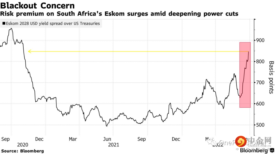 削减供电事发生后,Eskom的信用风险飙升,其2028年到期的美元债券相对于类似期限的美国国债收益率溢价扩大至847个基点,为2020年11月以来的最高水平。