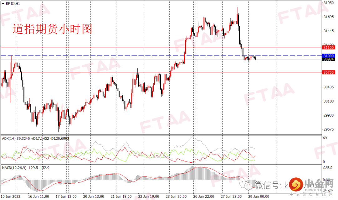 周二美股三大指数集体收跌,纳指跌近3%。道指跌491点或1.56%。数据方面,美国6月份消费者信心降至2021年2月以来最低,此外,油价重新上涨增加通胀担忧。道指高开短暂冲高后单边震荡走低,在20日线受阻,日图收出上影中阴,短线或维持偏空。道指期货方面,昨日亚欧盘维持强势震荡,美盘开盘拉升短线新高,但随后持续跳水。当前小时图一笔下跌力度较大,日内或维持弱势。操作上可现价附近,或逢高在31000附近轻仓空,止损31150,目标30700。