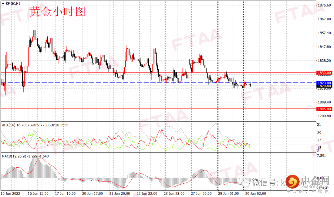黄金期货周二延续震荡下跌,最高1830.50,最低1819.10,日图收出上影小阴,显示短期空头继续主导,当前价格已靠近此前低点,下破概率增加。小时图看,昨日亚盘金价小幅反弹,但欧美盘时段震荡回落,美盘时段美元指数上涨压低金价。当前MACD指标持续绿盘运行,日内或延续弱势。今早亚盘金价窄幅波动,操作上可持有空单,或逢高在1823附近轻仓空,止损1830,目标1805。