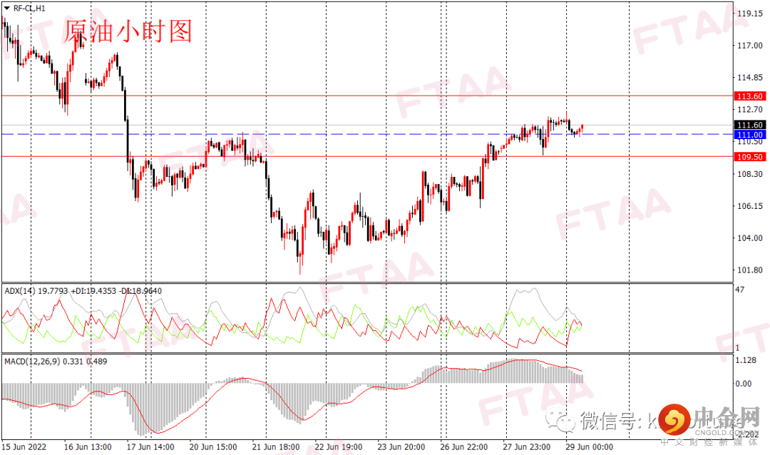 原油周二延续上涨,最低109.61,最高112.18,日图收出上下影小阳,显示短期多头继续主导,日图级别维持升势。七国集团会议考虑加紧对俄能源出口制裁,此外消息称5月欧佩克+减产执行率上升至256%。供需面紧平衡继续支撑油价。昨日亚欧盘油价震荡盘升,美盘开盘一度回踩,但随后重新回弹短线新高。当前小时图或延续强势。今早亚盘油价小幅调整,当前止跌,操作上可持有多单,或逢低在111附近轻仓多,止损109.50,目标113.60。
