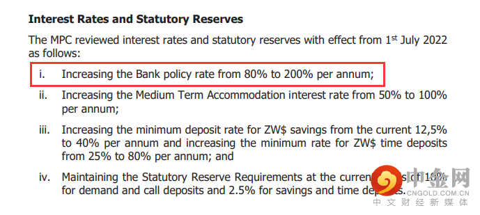 津巴布韦央行声明称,“通胀率上升正在削弱消费者的需求和信心,如果不加以控制,它将扭转过去两年取得的显著经济收益。委员会决定采取措施,使利率与通胀进展保持一致,并在引入金币的基础上加强外汇流通。”