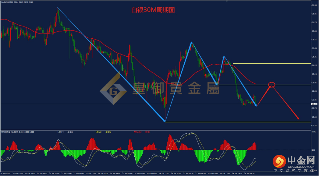 从下图的白银30M周期图来看,前期行情围绕着60均线震荡下跌,昨日行情刚好反弹至60均线附近受阻回落,美盘时段大幅下跌,最低下挫至20.78一线。目前银价仍处于60均线下方运行,MACD也处于0轴下方运行,空头趋势较强。日内关注上方压力21.09、21.27,下方支撑20.59,操作上建议反弹做空为主。