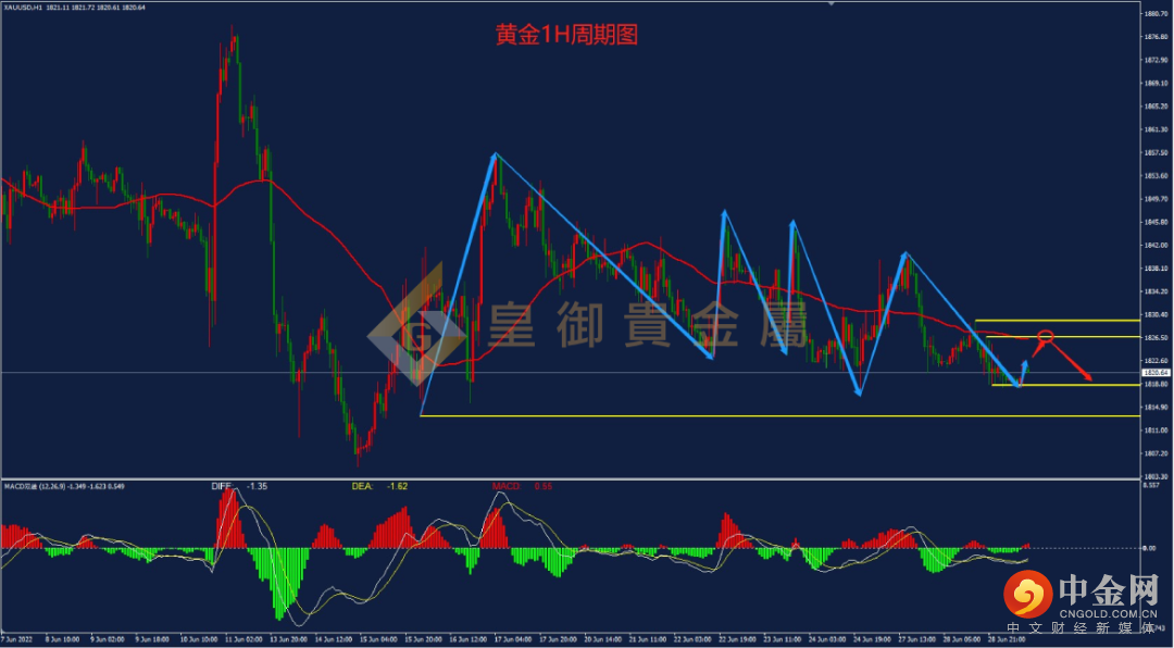 昨日(6月28日),旧金山联储主席戴利在讲话中表示,劳动力市场目前非常强劲,这让美国在实现软着陆方面处于更有利的位置。预计美国的经济增长将会放缓,也许会低于2%,但不会是负增长。纽约联储主席威廉姆斯称,衰退不是他的基本预期。美国长期中性利率没有改变,仍然很低。这就是美联储今年、明年需要大幅加息的原因之一。联邦基金利率达到3.5%-4%是合理的,但下次会议是加息50个基点还是75个基点还需讨论。他还表示,今年肯定需要把利率提高到3%-3.5%。受美联储官员们鹰派言论的影响,金价反弹乏力,昨日最高上探至1829.3一线后,随后受阻回落,盘中跌破重要支撑位1820,最低下挫至1818附近,目前金价维持在1820附近盘整。