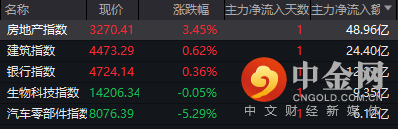 据wind主题行业看,房地产指数、建筑指数、银行指数、生物科技指数、汽车零部件等主力净流入额排名靠前,其中,房地产指数净流入额达48.96亿元。