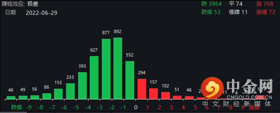 个股来看,近4000家个股下跌,跌停53家,当日市场赚钱效应极差。