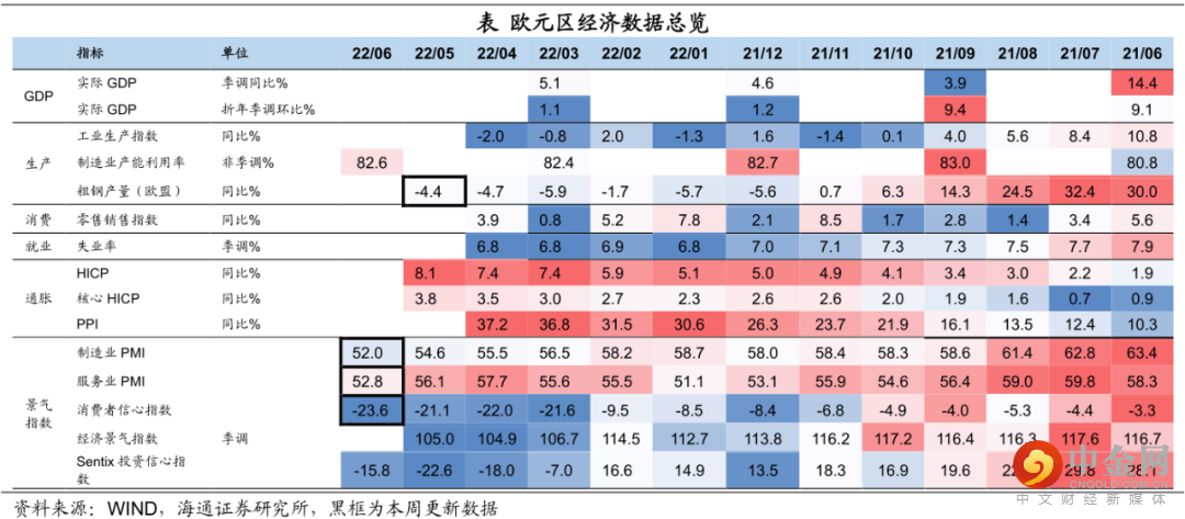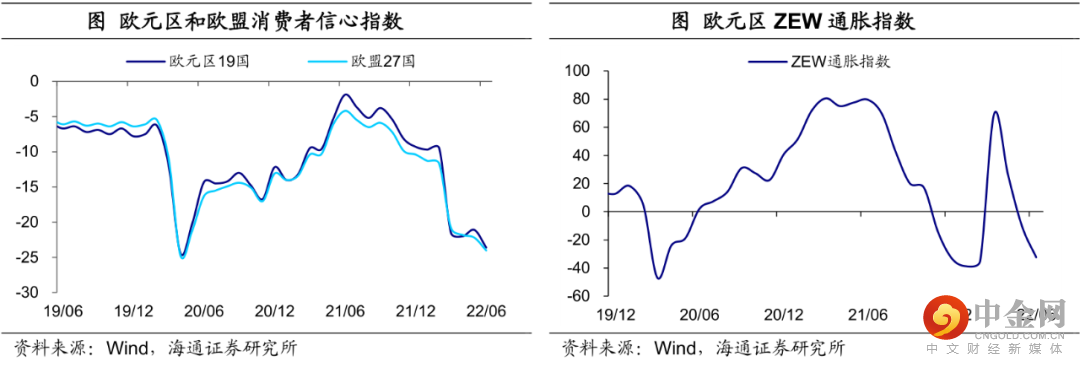 景气指数大幅下降。6月欧元区19国制造业PMI指数为52.0,创2020年8月以来新低;服务业PMI指数为52.8,较上月大幅下降。6月欧元区19国消费者信心指数为-23.6,欧盟27国消费者信心指数为-24.0,均创历史新低。