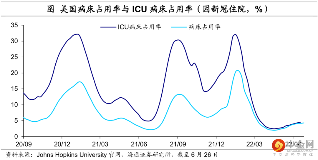 美国医疗负担小幅缓解。截至6月26日,美国住院病床占用率下降至75.8%,其中,因新冠住院占用率增长至4.3%;美国ICU病床占用率小幅下降至71.1%,其中,因新冠ICU占用率继续上行至4.6%。不过整体来看,仍在相对低位。