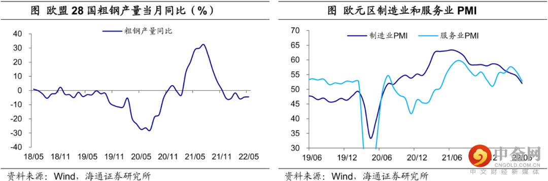粗钢产量下降。5月欧盟28国粗钢产量当月同比为-4.4%,连续6个月为负。粗钢产量的持续下降或与能源供应紧张以及生产成本抬升等因素有关。