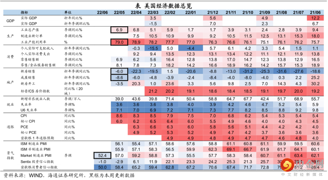 经济:美国生产增长仍强,5 月美国工业总产值同比增长 6.9%,5 月工业产能利用率为 79.0%。美国房产销售下降,5 月美国新建住房销售折年季调同比-6.0%,成屋销售折年季调同比-8.6%,或与抵押贷款利率的持续增长等因素有关。美国景气指数持续下降,6 月美国 Market 制造业季调 PMI 指数为52.4,服务业 PMI 指数为 51.6,均较 5 月都有所下降。CME Group 数据显示,截至 6 月 24 日,市场预期全年加息次数 12 次的概率仍为 100%,而至少加息 13 次的概率回落至 86.8%。美债收益率回落至 3.13%,主因美债实际收益率回落,通胀预期也有所回落。欧洲粗钢产量下降,5 月欧盟 28 国粗钢产量当月同比为-4.4%,连续 6 个月为负,或与能源供应紧张以及生产成本抬升等因素有关。欧洲景气指数大幅下降,6 月欧元区 19 国制造业 PMI指数创 2020 年 8 月以来新低;6 月欧元区 19 国消费者信心指数也创历史新低。
