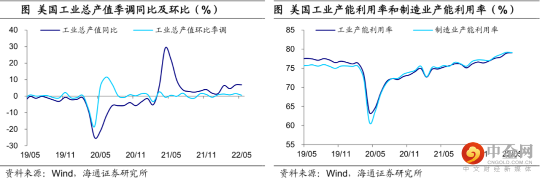 生产增长仍强。5月美国工业总产值同比增长6.9%,季调环比增长0.6%。5月工业产能利用率为79.0%,制造业产能利用率为79.1%,基本与上一月持平。总体来说,生产仍保持较强的增长趋势。