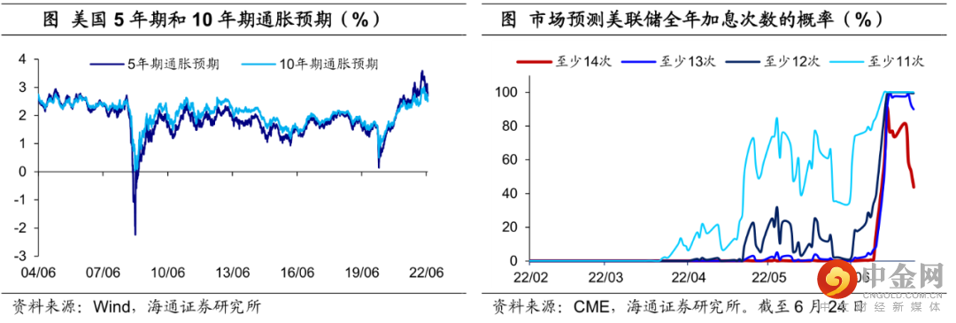 通胀预期回落。截至6月24日,美国5年、7年、10年期通胀预期,分别较上周末(6月17日)下行5、7、6个BP。CME Group数据显示,截至6月24日,市场预期全年加息次数12次的概率仍为100%,而至少加息13次的概率回落至86.8%,其中, 7月加息75BP的概率为八成,较上周末有回落。