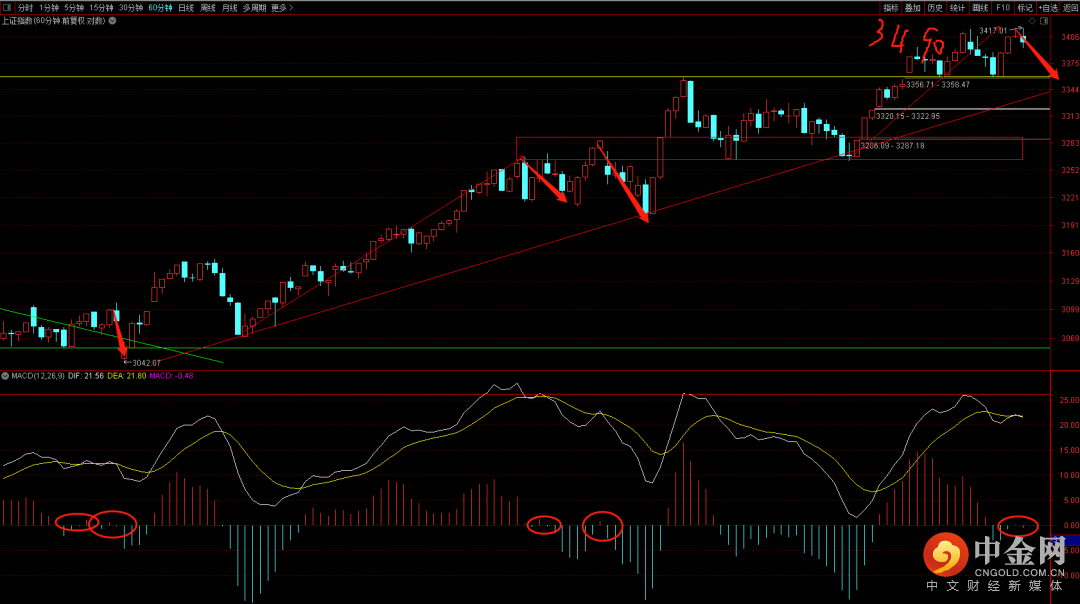 大盘低开后快速上冲,短期再次创出新高,目前从六十分钟结构看正在走衰竭段,注意下周可能出现的回落走势,下方支撑可能出现在3290到3336这个区间。而后续的脱离段在没有突破3490的情况下大概率都会再次回落在这个平台中,而只有跌破3260才有可能结束这段自2863以来的上涨趋势段。