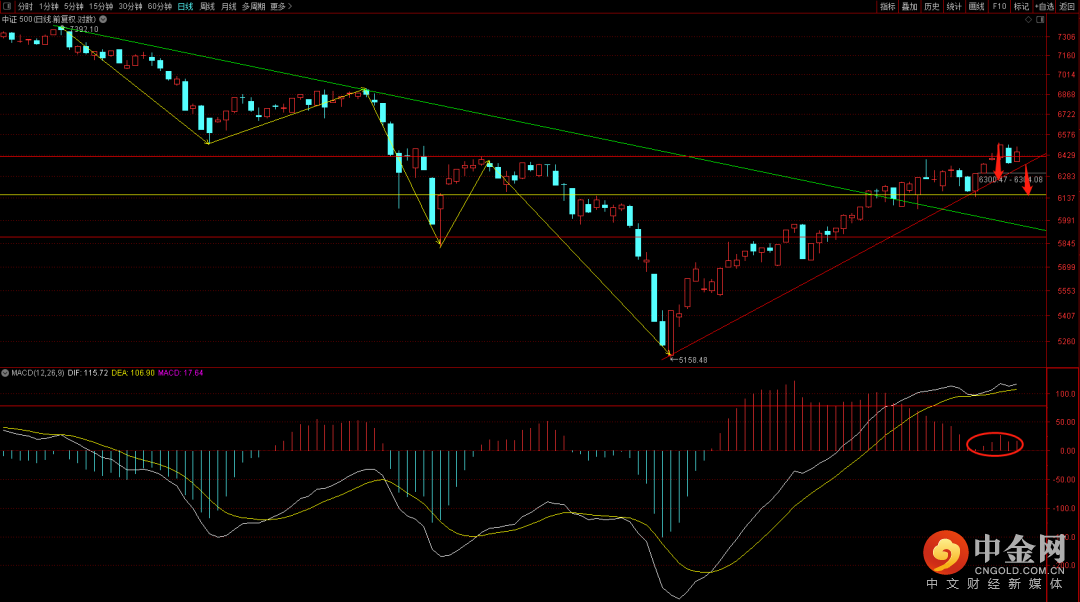 中证500短期关注6370点支撑,如果跌破则构筑三十分钟头肩顶形态,届时大概率会回落到6155附近。而上方6666点将会是强压制,在没有突破之前上涨空间将受限,而一旦后续行情中出现突破的话就有上升至7010附近的可能。