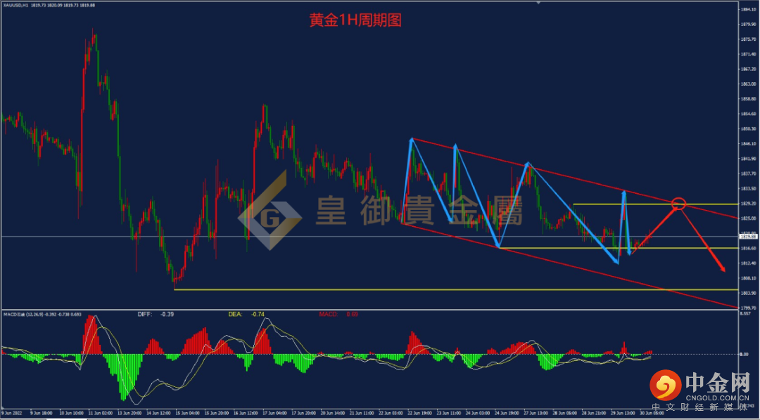 从下图的黄金1H周期走势图来看,近期行情一直围绕着下降通道线进行宽幅震荡,整体走势呈现高低点同步下移的震荡偏空格局。昨日欧盘时段金价下探至1812一线后便迎来触底反弹,迅速上冲至1832.7附近,再次触碰通道上轨压力,随后承压回落,吞没所有涨幅,再次下探至前低附近。目前MACD仍处于0轴下方运行,多头反弹动能乏力,整体走势依然偏空。日内关注上方压力1829,下方支撑1817、1805,操作上建议反弹做空为主。