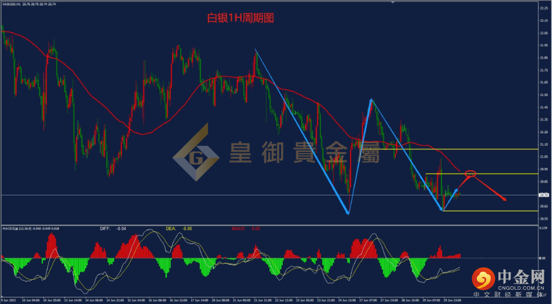 从下图的白银1H周期图来看,近期行情围绕着60均线震荡向下运行,且高点逐步下移,整体走势震荡偏空。昨日反弹至60均线附近时,多头动能衰竭,行情再次承压回落,最低下挫至20.61一线。目前银价仍处于60均线下方运行,MACD也处于0轴下方运行,空头趋势还在延续。日内关注上方压力20.91、21.11,下方支撑20.61,操作上建议反弹做空为主。