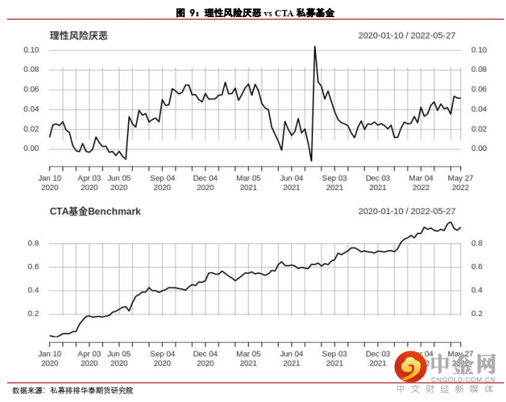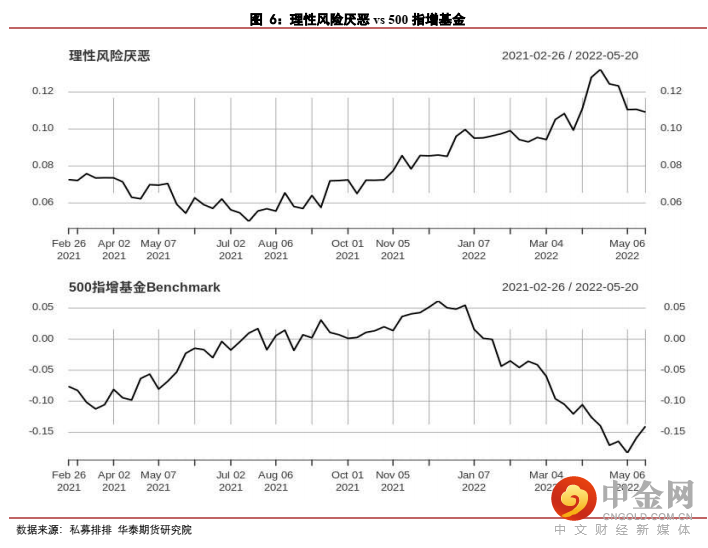 从图中我们不难看出,理性风险厌恶与基金Benchmark保持负相关性。从趋势上来看,理性风险厌恶指标下行往往说明市场行情较好;而理性风险厌恶迅速上行则预示着市场转向,风险迅速放大,行情走弱。特别地,当理性风险厌恶达到极端值的时候,则有可能预示行情的转折。举例来说,目测可知基金Benchmark在4月底至5月初的低点,对应了提前1-2周的理性风险厌恶指标的极大值。