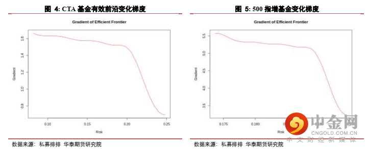 然后,我们观察有效前沿随风险目标变化的敏感度。这里我们也看到了相似性,有效前沿在风险区间靠前的大半部分,其变化都保持恒定速度,并无特别的市场敏感性,连续性也较好,权重分布依然较分散,非常适合我们用来计算理性风险厌恶指标,捕捉基金的群体行为特征。而靠近风险较高部分则正好相反,所以,CTA基金组合年化波动率高于20%,指增组合波动率高于19%的权重部分将不会用于我们的后续分析。