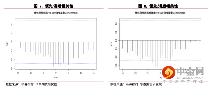 以同步相关性(lag=0)区隔指标与市场的领先/滞后特征。首先,相关性基本保持在负值区间则表示了指标与市场之间的负相关性。其次,在lag左边,也就是lag<0时,指标超出95%置信区间(图中虚线),就表示指标具备对于基金Benchmark的领先性,具有指导意义。