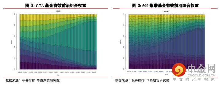 这两个大类策略在权重分布上有一定的相似性,在靠近MVP附近,权重分布更为均衡;而在风险较高部分,权重会更倾向于集中到1-2个高波动基金,风险分散化效果较差。