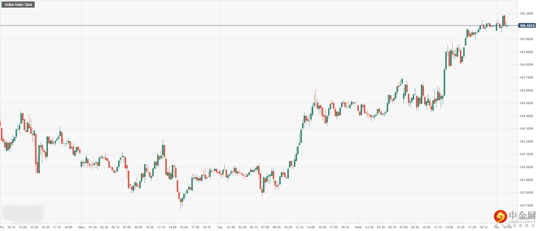 美元指数周三收盘大幅冲高后,今日开盘升0.6%至105.10附近,由于全球股市因经济衰退风险增加而下跌,市场购买美国资产以求避险,使得美元上行支撑提振。