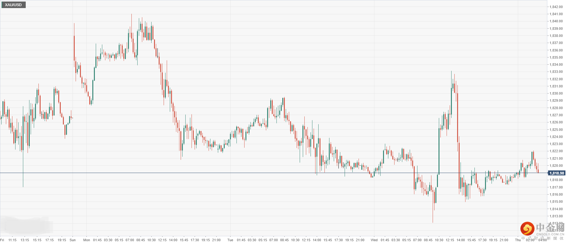 黄金兑美元周三盘中冲高回落后,今日开盘跌至1818.98附近,因全球主要央行行长强调必须迅速采取行动打击通胀,尤其美联储主席鲍威尔的讲话带头鹰派,导致金价下行震荡疲软。