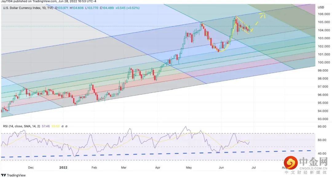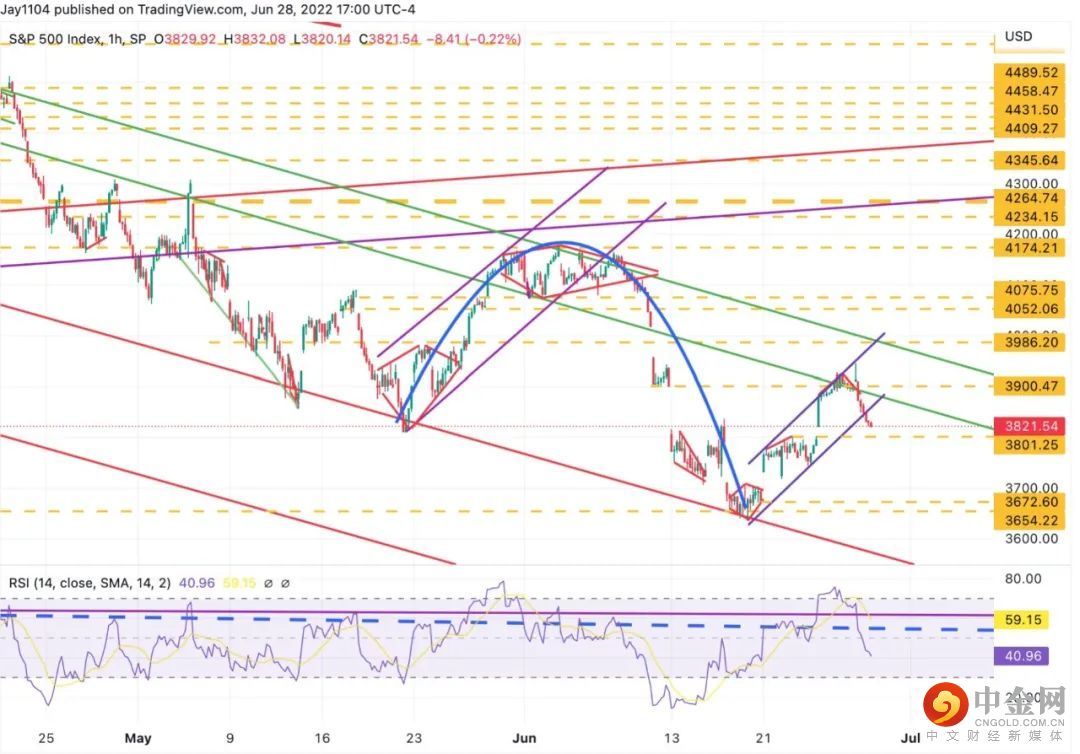 美元指数的形态让我意识到标普500指数可能有一个好机会。标普500指数目前第一层支撑线将位于3800点附近,下一支撑线位于3675点附近。