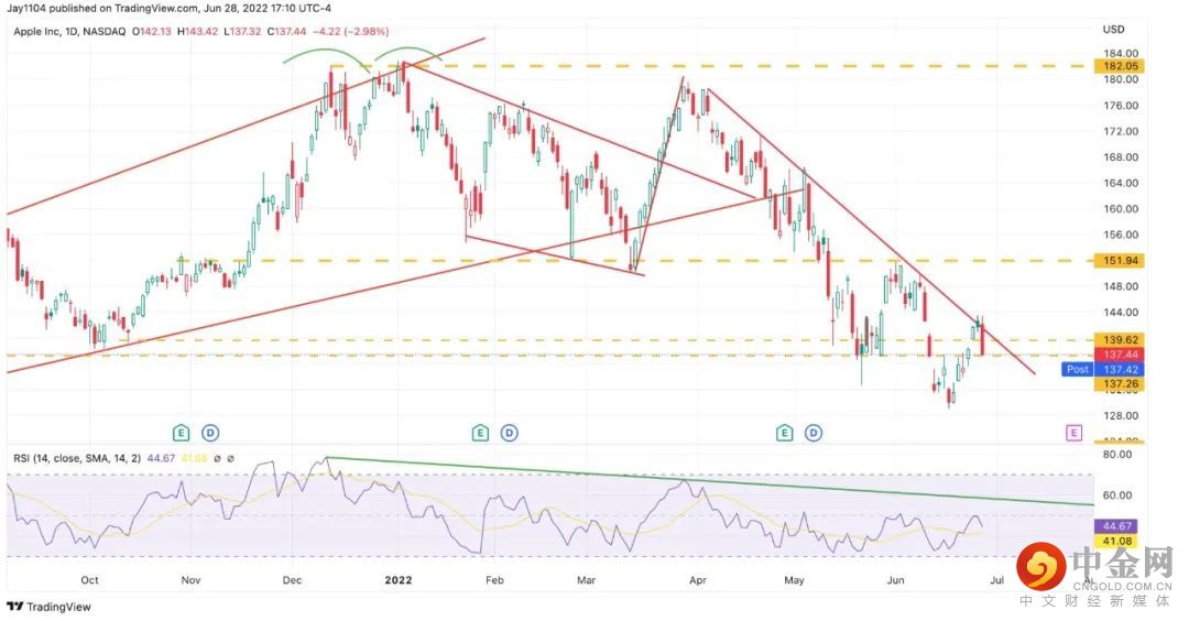 苹果公司的股票昨天触及趋势线,不过今天却失败了。苹果公司的股价需要维系在130美元的关键水平线上方。如果苹果公司股价创新低则是从很大可能创新低。