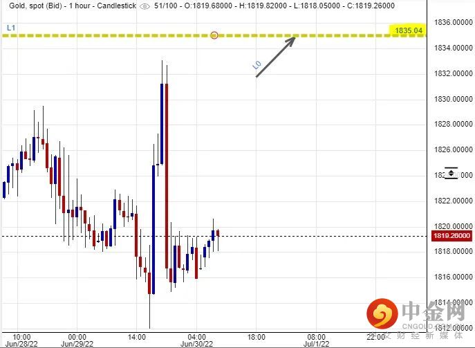 可以部署在$1,835美元左右建立淡仓盘,短线看淡金价一线至$1,803美元水平后止赚,止损在$1,843美元。