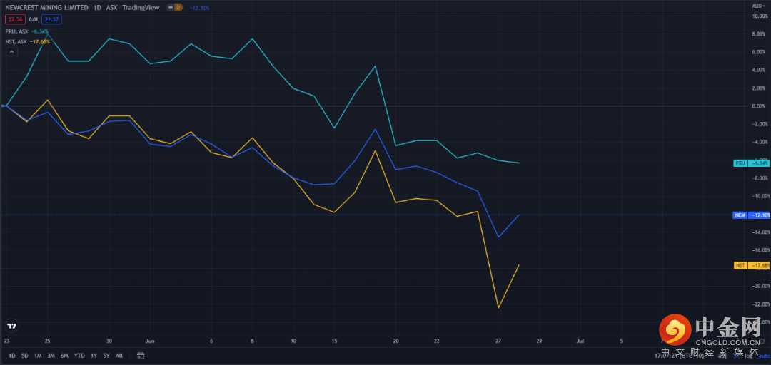 不仅如此,在今年各国央行疯狂加息的大环境下,表现一直不如人意的澳交所上市金矿公司也同样出现了起色—— Newcrest Mining Limited (NCM)、Northern Star Resources Limited(NST)以及Perseus Mining Limited(PRU)也在“禁金”后出现上涨。