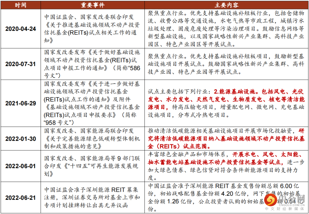 2021年6月,国家发改委印发《关于进一步做好基础设施领域不动产投资信托基金(REITs)试点工作的通知》及附件《基础设施领域不动产投资信托基金(REITs)试点项目申报要求》(以下简称“958号文”),新增能源基础设施作为试点行业,包括风电、光伏发电、水力发电、天然气发电、生物质发电、核电等清洁能源项目,特高压输电项目,增量配电网、微电网、充电基础设施项目,分布式冷热电项目。