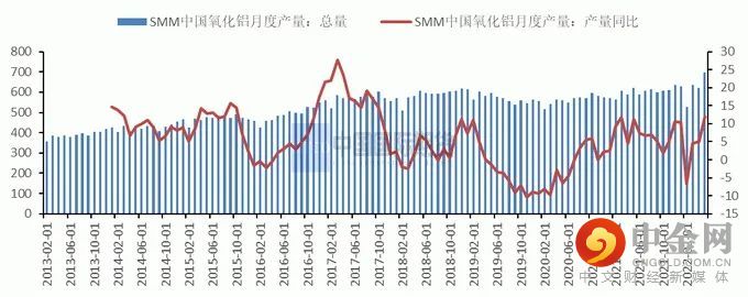 图1:中国氧化铝月度产量情况 单位:万吨、%